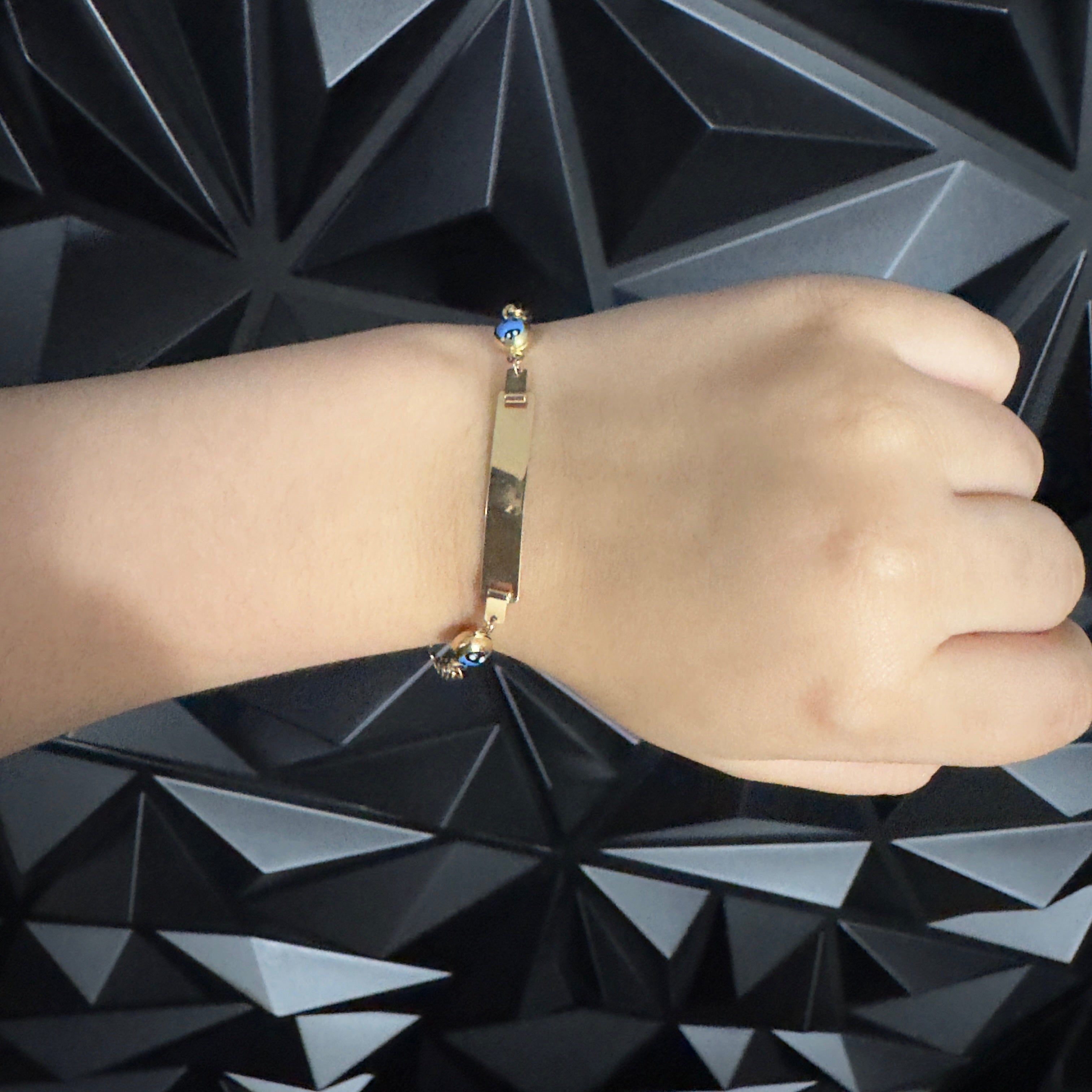 This elegant 14K yellow gold baby bracelet features a classic Figaro chain design, perfectly sized for little wrists. At its center is a polished ID plate, ideal for engraving a name or special date. Accented with two protective blue evil eye beads, this bracelet offers both style and a touch of symbolic safeguarding. A secure spring ring clasp ensures a comfortable and safe fit for daily wear or special occasions. A meaningful and timeless gift for newborns, christenings, or birthdays.